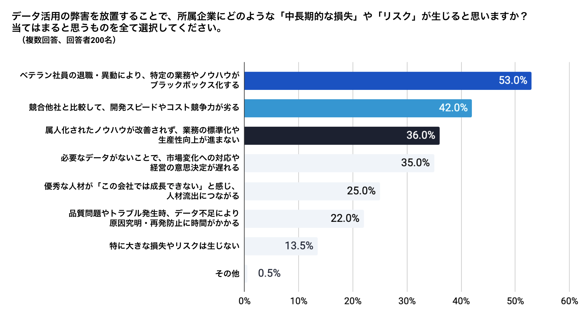 ・データ活用の弊害を放置することによる中長期的なリスクとしては、「ベテラン社員の退職・異動でノウハウがブラックボックス化する」(53.0%)が最多で、次いで「競合と比べて開発スピードやコスト競争力が劣る」(42.0%)、「属人化したノウハウが改善されず標準化・生産性向上が進まない」(36.0%)といった将来の競争力低下への懸念が挙がりました。
