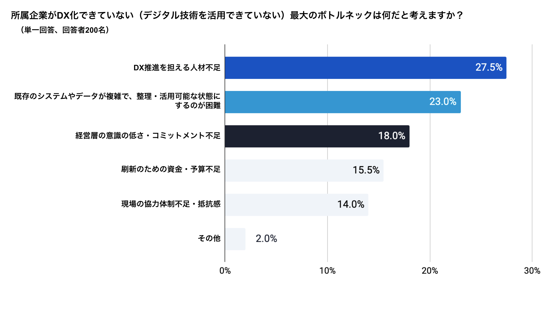 ・所属企業がDX化できていない理由として最も多く挙げられたのは「DX推進を担える人材不足(27.5%)」、続いて「既存システムやデータが複雑で整理が困難(23.0%)」という回答でした。