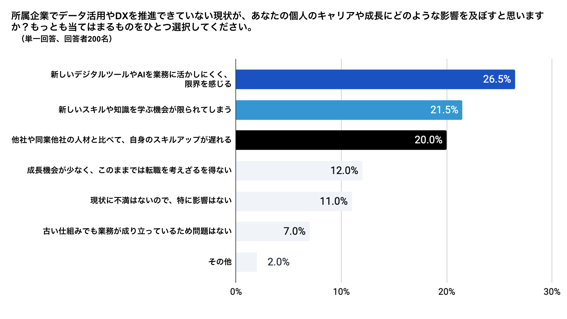 ・所属企業でDXが進んでいないことによる個人への影響については、「生成AIやデジタルツールを業務に活かしにくく限界を感じる」(26.5%)、「新しいスキルや知識を学ぶ機会が制限される」(21.5%)、「他社や同僚と比べてスキルアップが遅れる」(20.0%)といったキャリア成長機会の損失が懸念されていました。