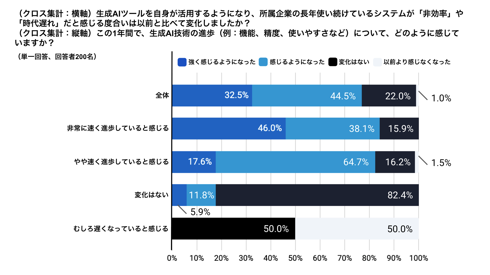 ・ここ1年間で個人でAIを活用する人が急増する中、特に技術進化を実感している層では、自社システムの「非効率」や「時代遅れ」をより強く認識している実態が浮かび上がりました。