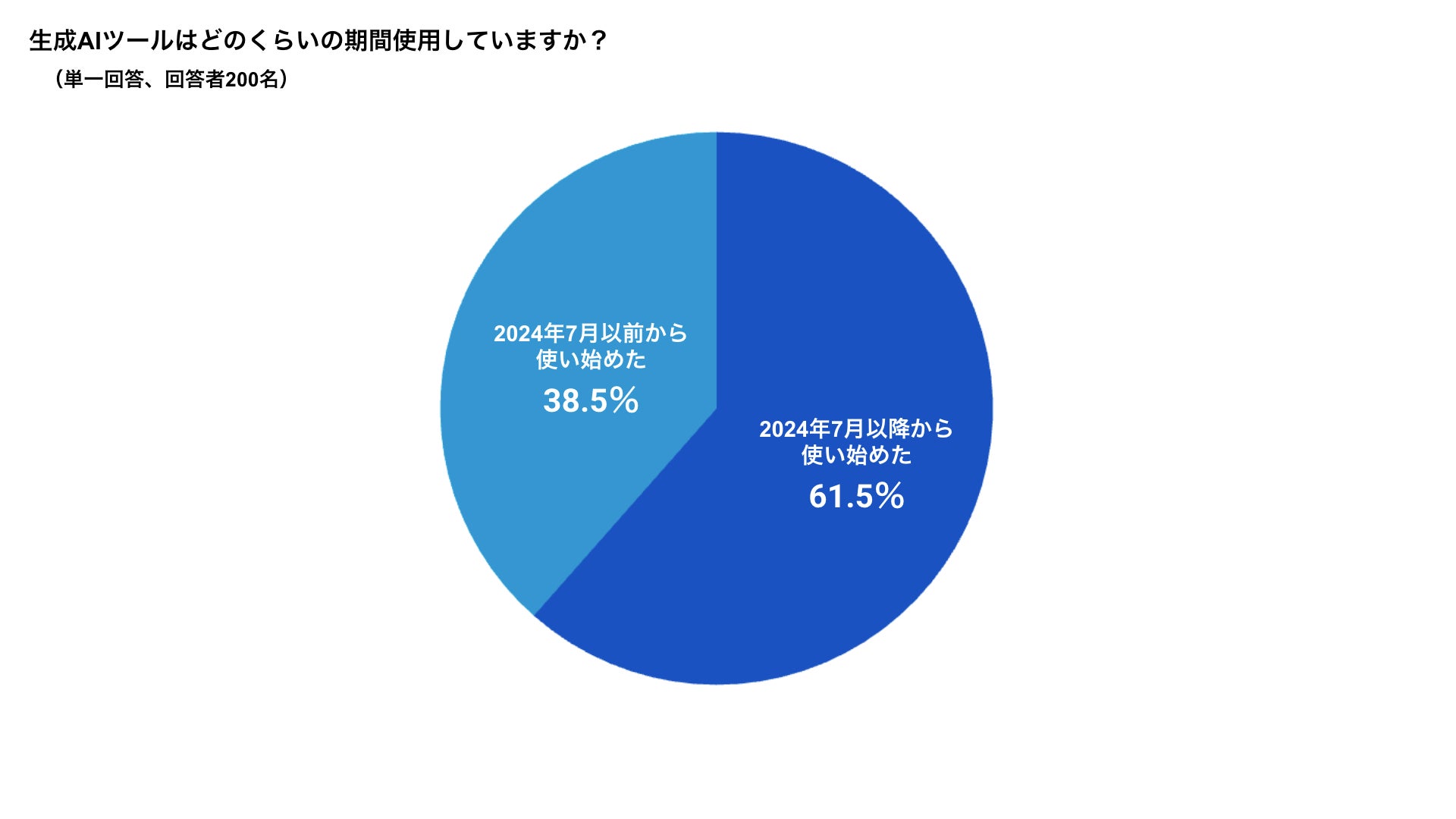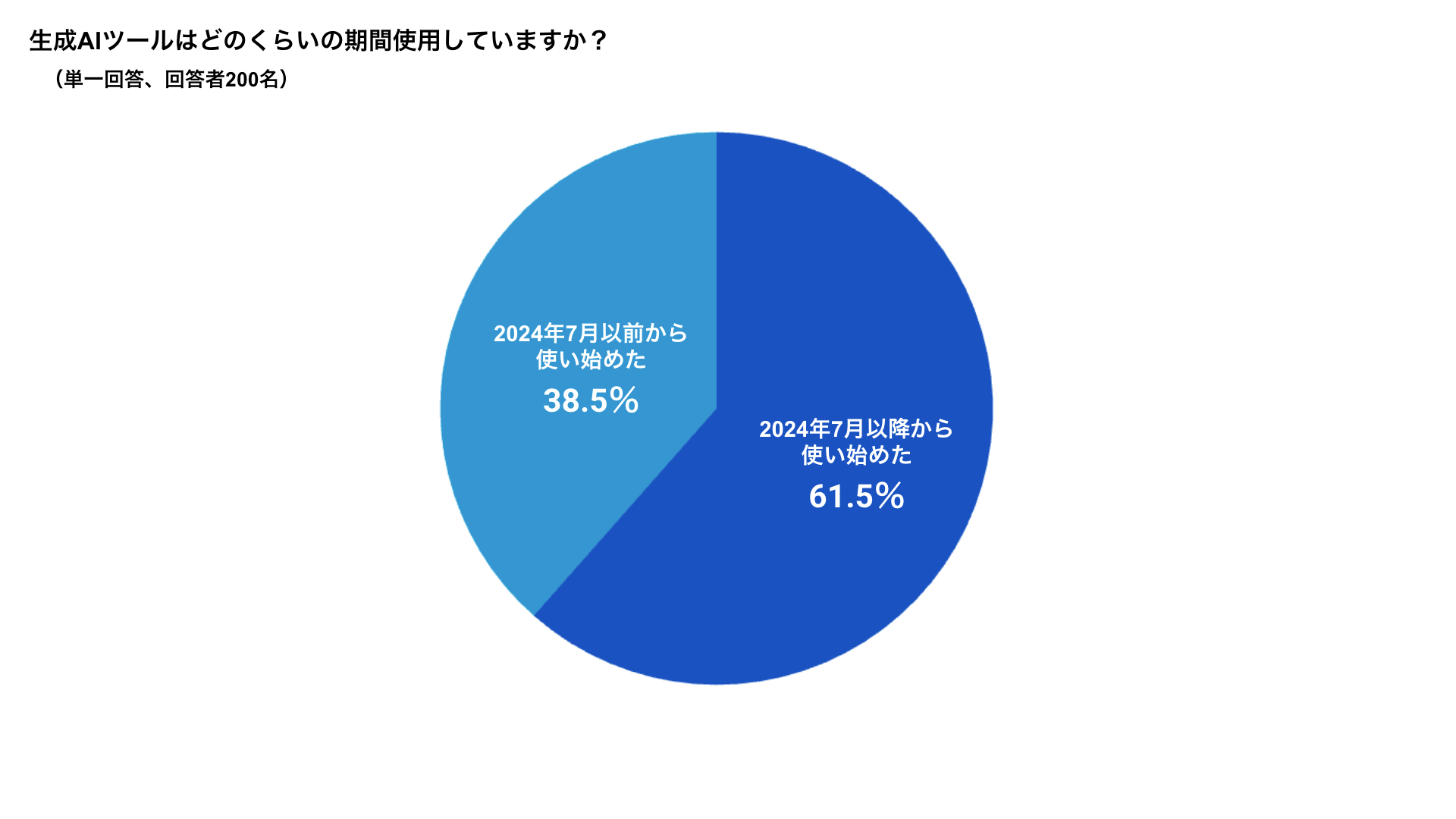● 生成AIの利用、約6割(61.5%)が「2024年7月以降から使い始めた」と回答。この1年で個人レベルでのAI活用が急速に浸透している実態が明らかになりました。