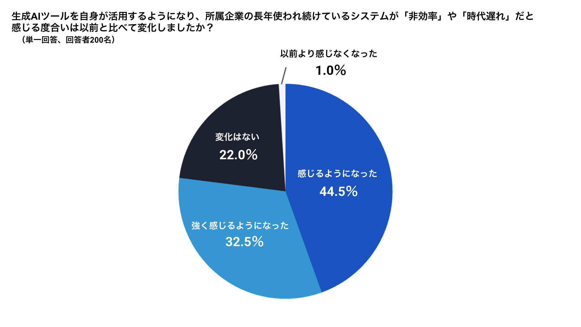 ● 生成AIを使うようになったことで、約8割が自社の長年使われ続けているシステムを「より非効率・時代遅れ」と感じるようになったと回答。
