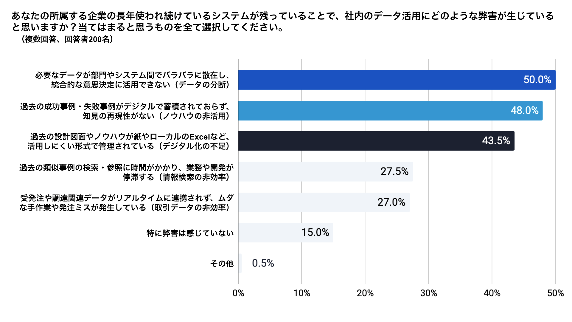 ・「特に弊害を感じていない」と回答した人はわずか15.0%にとどまり、多くの現場で長年使い続けているシステムが“データ活用のボトルネック”になっていることが明らかになりました。