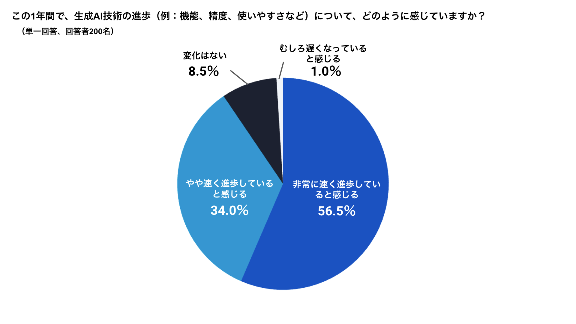 ・生成AIを使用している人のうち56.5%が「この1年間で生成AIの『進歩が非常に早いと感じている』」と回答し、「やや早く進歩している」も合わせると90.5%に達しました。AI技術の進化を体感している層が圧倒的多数であることが明らかになりました。