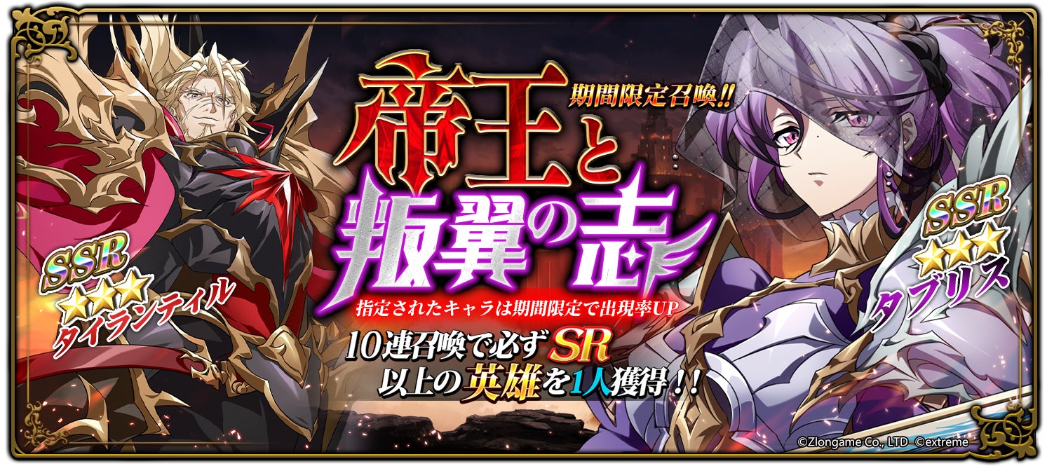 ZLONGAMEは、好評配信中の本格シミュレーションRPG『ラングリッサー モバイル』にて、9月10日(火)より新英雄「タイランティル」と「タブリス」の登場、期間限定召喚『帝王と叛翼の志』を実施することをお知らせいたします。