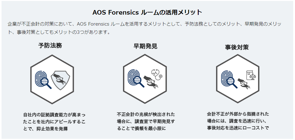企業が不正会計対策において、AOS Forensics ルームを活用するメリットとして、予防法務としてのメリット、早期発見のメリット、事後対策としてのメリットの3つが期待できます。