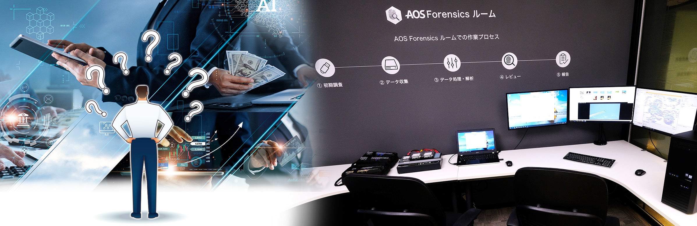 「AOS Forensics ルーム」は、フォレンジック調査ソフトやハードウェアをコンポーネントで構成されたシステムとして提供し、調査室の設置、システムの使い方、フォレンジック調査の方法、調査官の教育及び研修、調査支援などを行い企業内・フォレンジック調査室の構築を支援します。