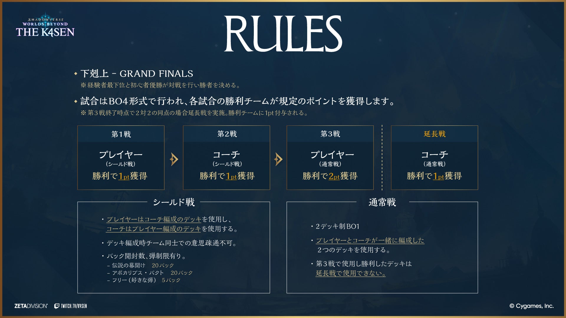 GANYMEDE株式会社(本社:東京都港区 代表:西原 大輔)が運営するプロeスポーツチーム「ZETA DIVISION」は、所属クリエイターであるk4senが主催するオンラインゲームイベント『Shadowverse: Worlds Beyond The k4sen Supported by Cygames』を、2026年4月22日(水)および4月23日(木)の2日間にわたり開催することをお知らせいたします。