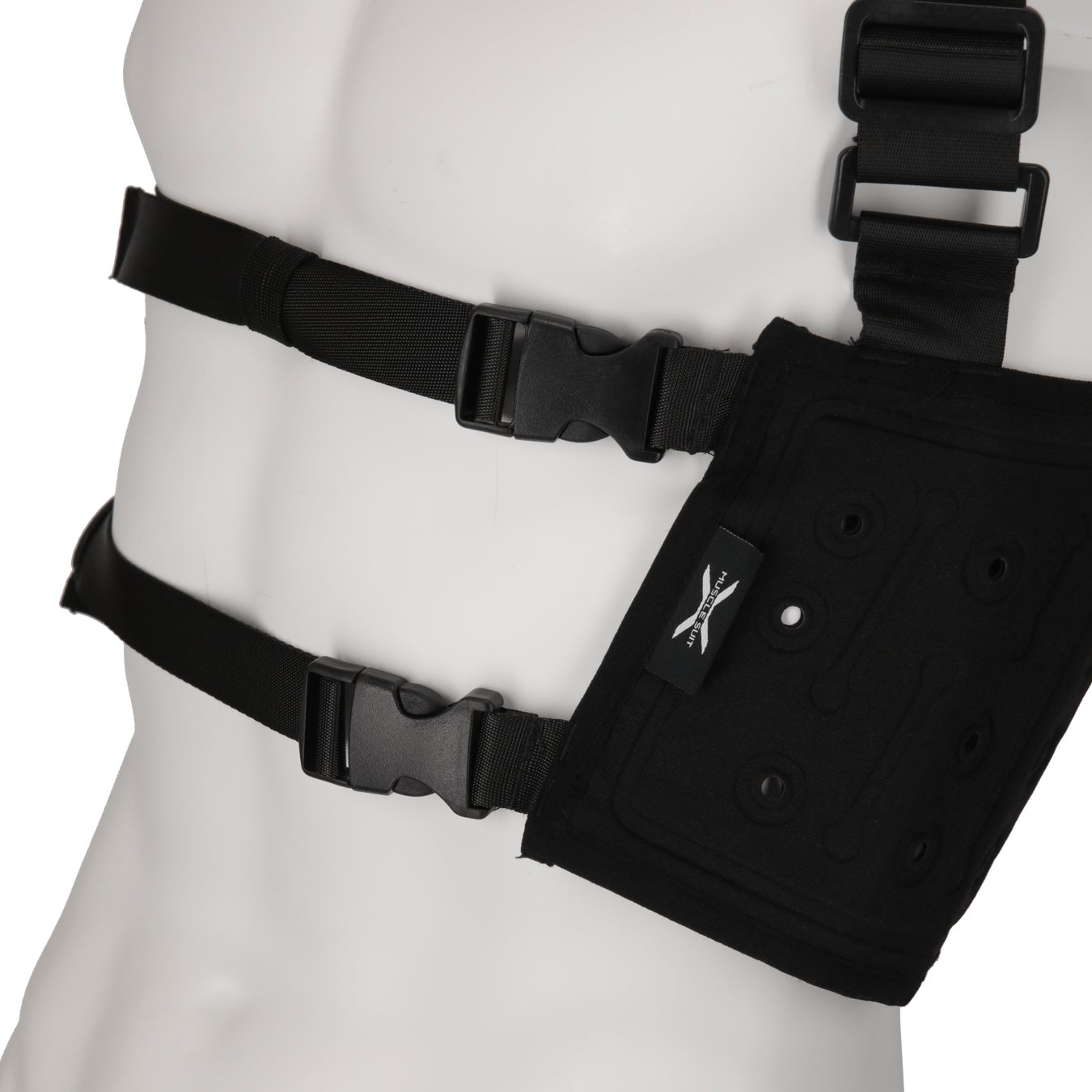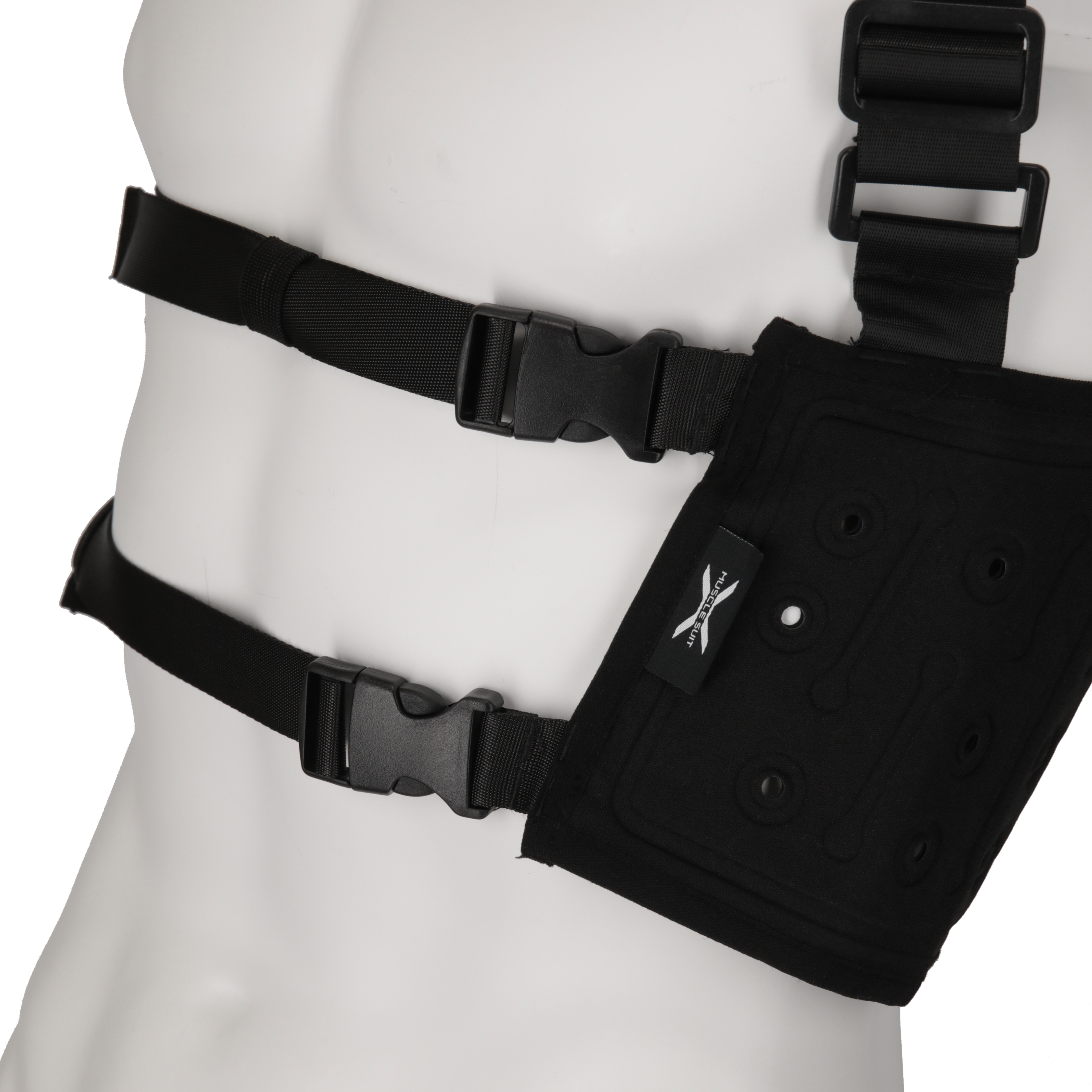 ファンは脇腹に配置。装着した状態での 運転やハーネス、マッスルスーツなどとの併用可能。
