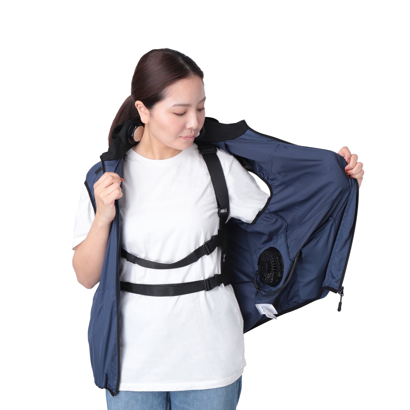 バッテリーや保冷剤がなくても水だけで冷却し、繰り返し使うことができる気化熱タイプのベストです。背中と脇が一体型になっており、脇まで水が行き渡りつつ、お腹は冷やさない設計。圧着点が多く蒸れにくい仕様で、通気性が高く軽量なため、着心地も快適です。中綿のない構造で乾きやすく、水の排出もしやすく衛生的に使用できます。着丈・身幅を調整可能なベルトとスライドバックル付き。ファン付きウェアのアンダーとしても着ることができます。製造・物流・農業・建設業向けに、充電管理が手間な現場や、電源不要のため、電気機器の持ち込みが制限される現場でも導入しやすい設計です。