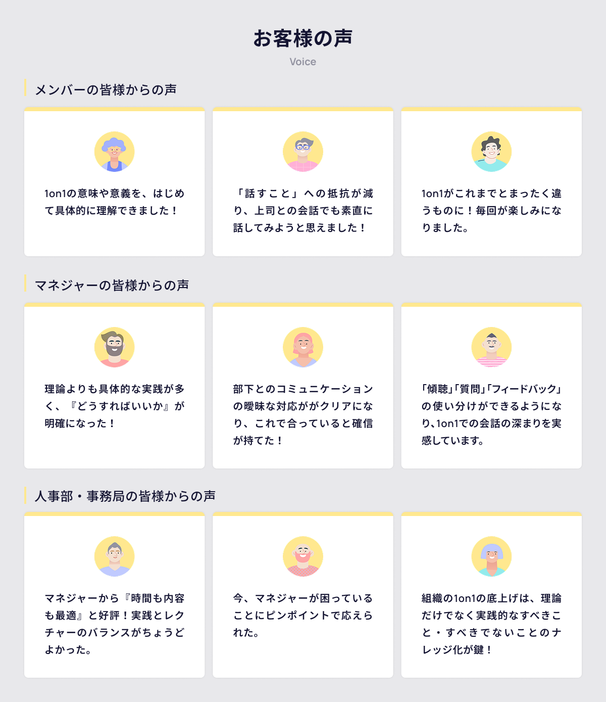 日常の1on1を通じて信頼と行動変容を生み出す「対話の型」を現場に定着させることを目的としており、メンバー・マネジャー・経営層それぞれの役割に合わせて構成されています。