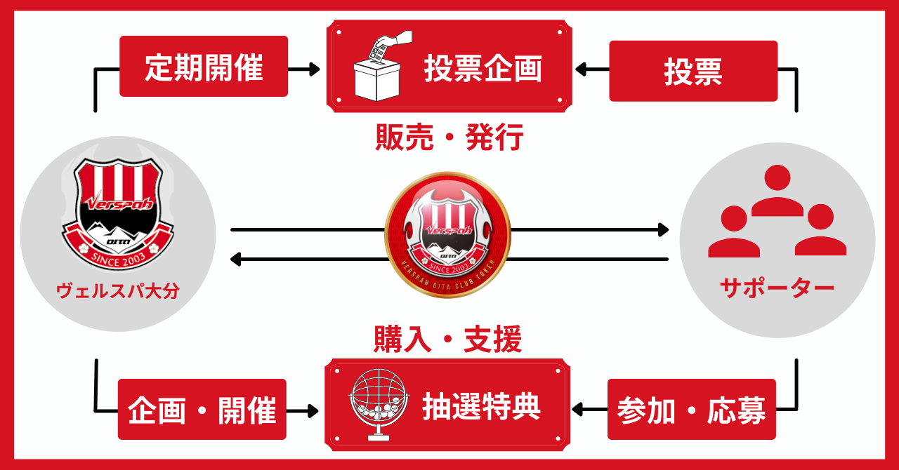 ヴェルスパ大分のトークンは”ヴェルスパトークン”としてFiNANCiE上で発行されます。トークンを購入いただいた方々は、運営の一部に携われる投票企画への参加や特典抽選などへ応募いただくことができます。