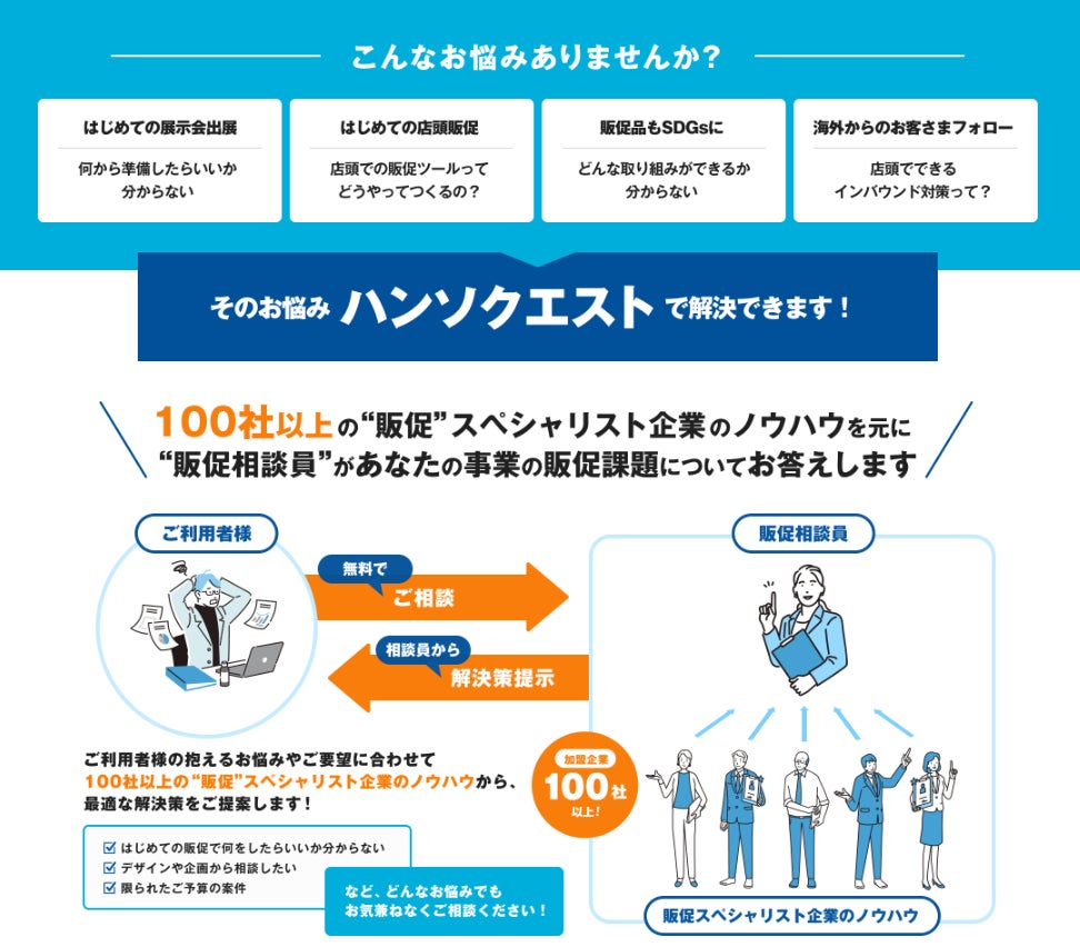 販促に関するあらゆる相談が【無料で】でき、ハンソクエストに登録している100社を超える販促スペシャリスト企業のノウハウと、当社の業界経験50年以上で得た知見により、販促担当者の業務の更なる効率化と生産性の向上をご支援します。