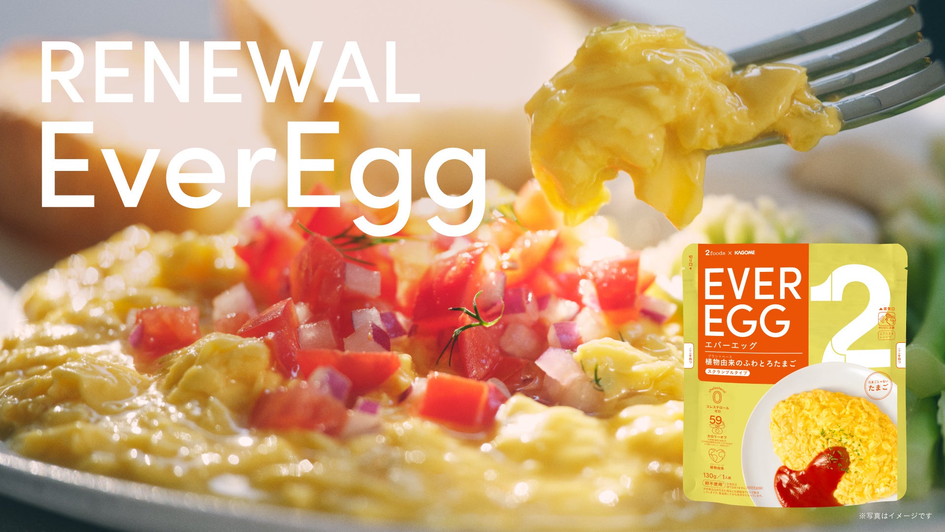 “欲しいものは、いつも2つある。”をコンセプトに、おいしさと健康の2つを追求したフードを展開するブランド「2foods(トゥーフーズ)」を手掛ける株式会社TWO(本社:東京都渋谷区/代表取締役CEO:東 義和/以下「TWO」)と、カゴメ株式会社(本社:愛知県名古屋市/代表取締役社長:山口 聡/以下「カゴメ」)が共同開発した植物由来の“ふわとろたまご”「Ever Egg(エバーエッグ)」常温タイプ※2 ※3がパッケージを一新し、賞味期間を延長してリニューアルいたしました。2foods 銀座ロフト店や2foods公式オンラインショップ、各種ECサイトに加え、全国のスーパーマーケットでも順次販売しています。