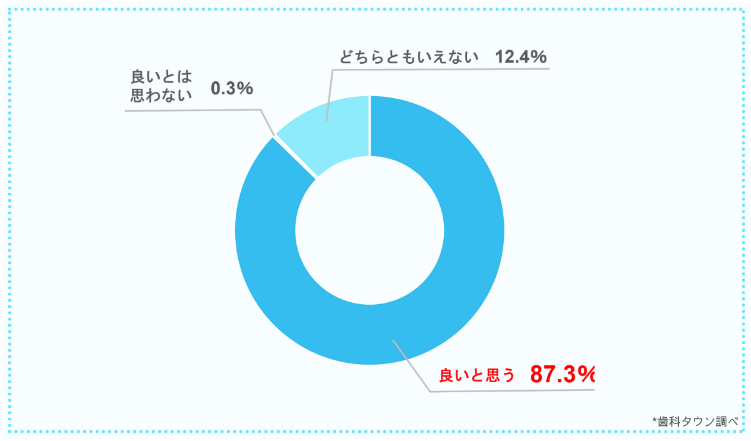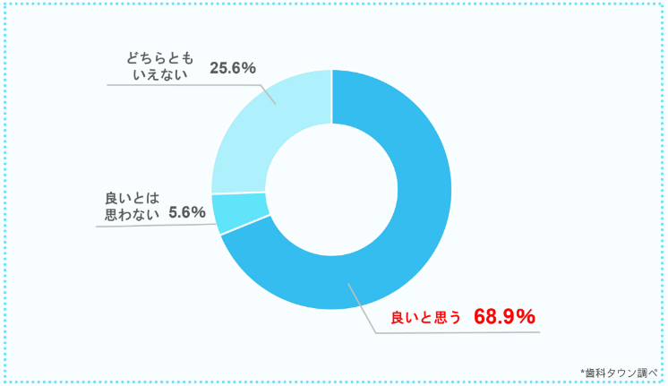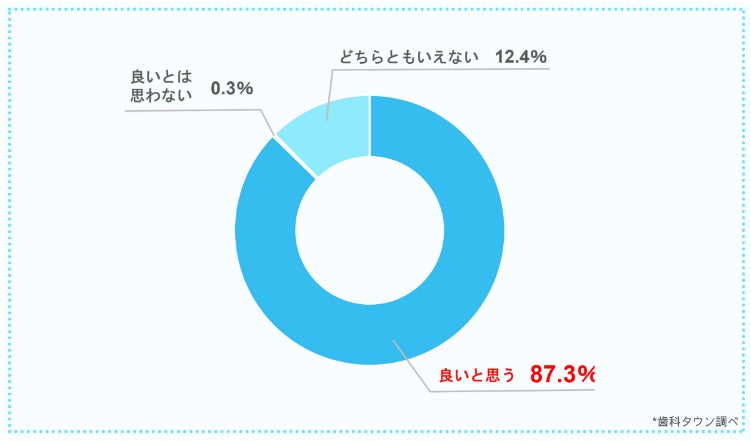 9割近くの人が「良いと思う」と回答していました。「自己負担が無くなれば、お金の心配をせずに通えるから(10代 女性)」、「国民の健康維持を保つ制度として、大変素晴らしいことだと思う(40代 男性)」など、国民皆歯科健診制度が歯の健康を維持する契機になると肯定的に捉えている人が多くいました。