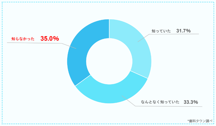 国民皆歯科健診制度の導入には、将来的な病気を予防する目的があることを「知らなかった」という回答が最も多く約35%に及びました。「知っていた」、「なんとなく知っていた」と回答した人は合わせて65%という結果に。