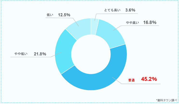 自身のオーラルケアに対する意識については、「普通」と回答する人が約45%と最も多い結果となりました。「低い」 、「やや低い」という回答は合わせて約35%、「とても高い」、「やや高い」という回答は合わせて約20%となり、オーラルケアに対する意識はあまり高くない結果となりました。