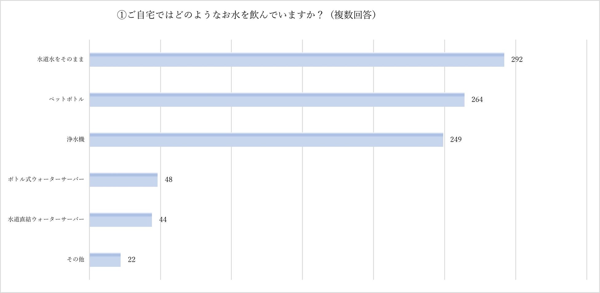 アンケートへの回答結果から、水分補給の方法として水道水(292件)に次いで「ペットボトル」を利用している人(264件)が多くみられました。