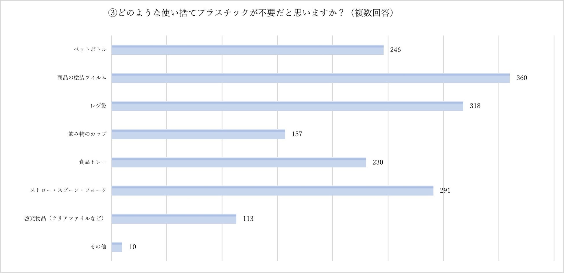 なお、「不要だと思う使い捨てプラスチック」の上位に「ペットボトル」(4番目、246件)が挙がっています。