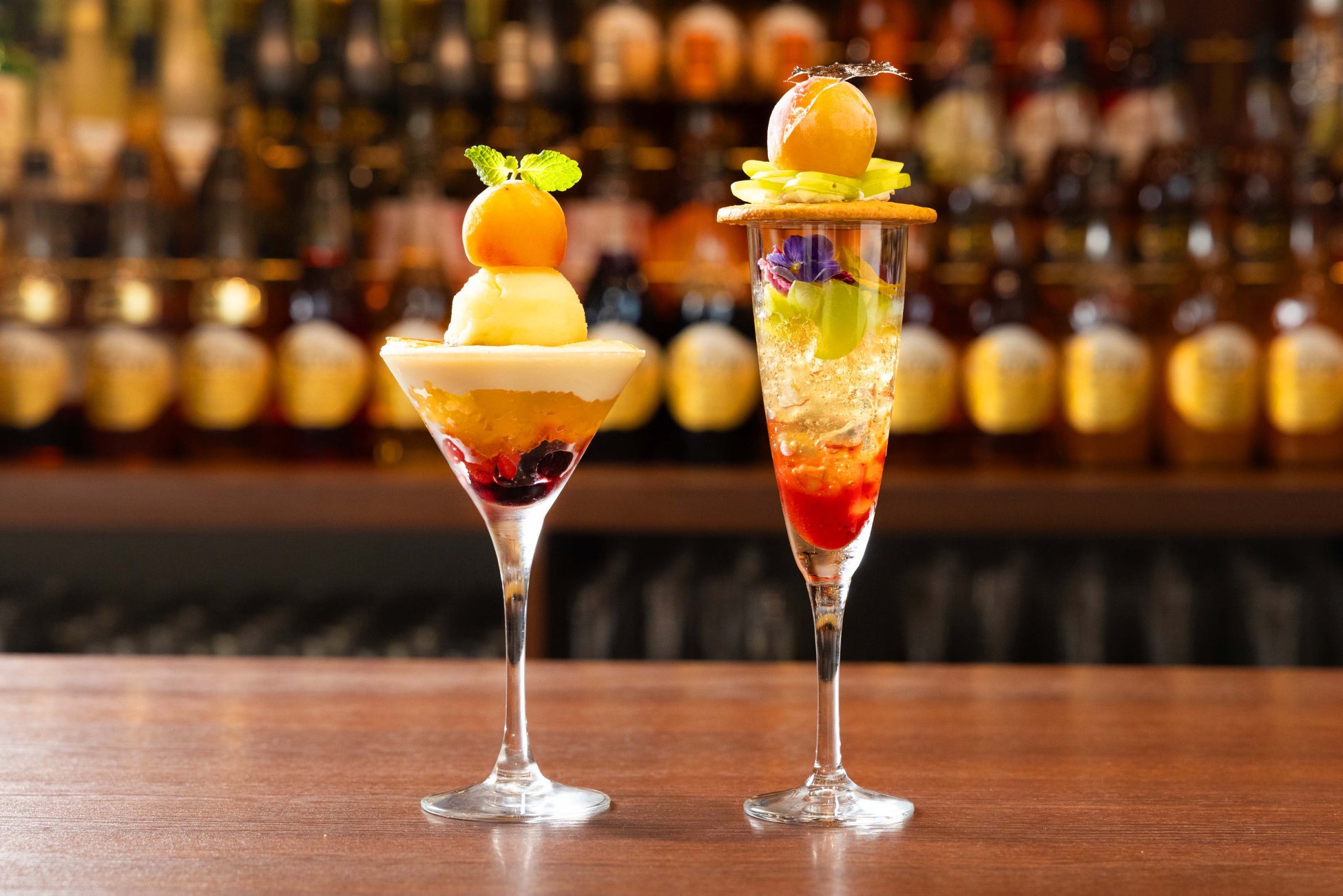 「梅ガトーフロマージュ」は、梅とベリーのジュレ層の上にチーズケーキ層を重ねてブリュレし、レモンシャーベットとフローズン完熟南高梅をトッピングしました。完熟梅のフルーティーで爽やかな酸味とクリーミーなチーズの味わいがマッチした濃厚タイプの梅パフェです。「梅マスカットロワイヤル」は、梅と苺のシロップにシャインマスカットとエディブルフラワーを加えた梅ジュレ層にガレットで蓋をしフローズン完熟南高梅をトッピング、仕上げにバーテンダーが梅酒のスパークリングワインを注ぐ事で華やかなロゼカラーで爽やかな口当たりのカクテルパフェです。共にアルコールタイプとノンアルコールタイプからお選びいただけます。