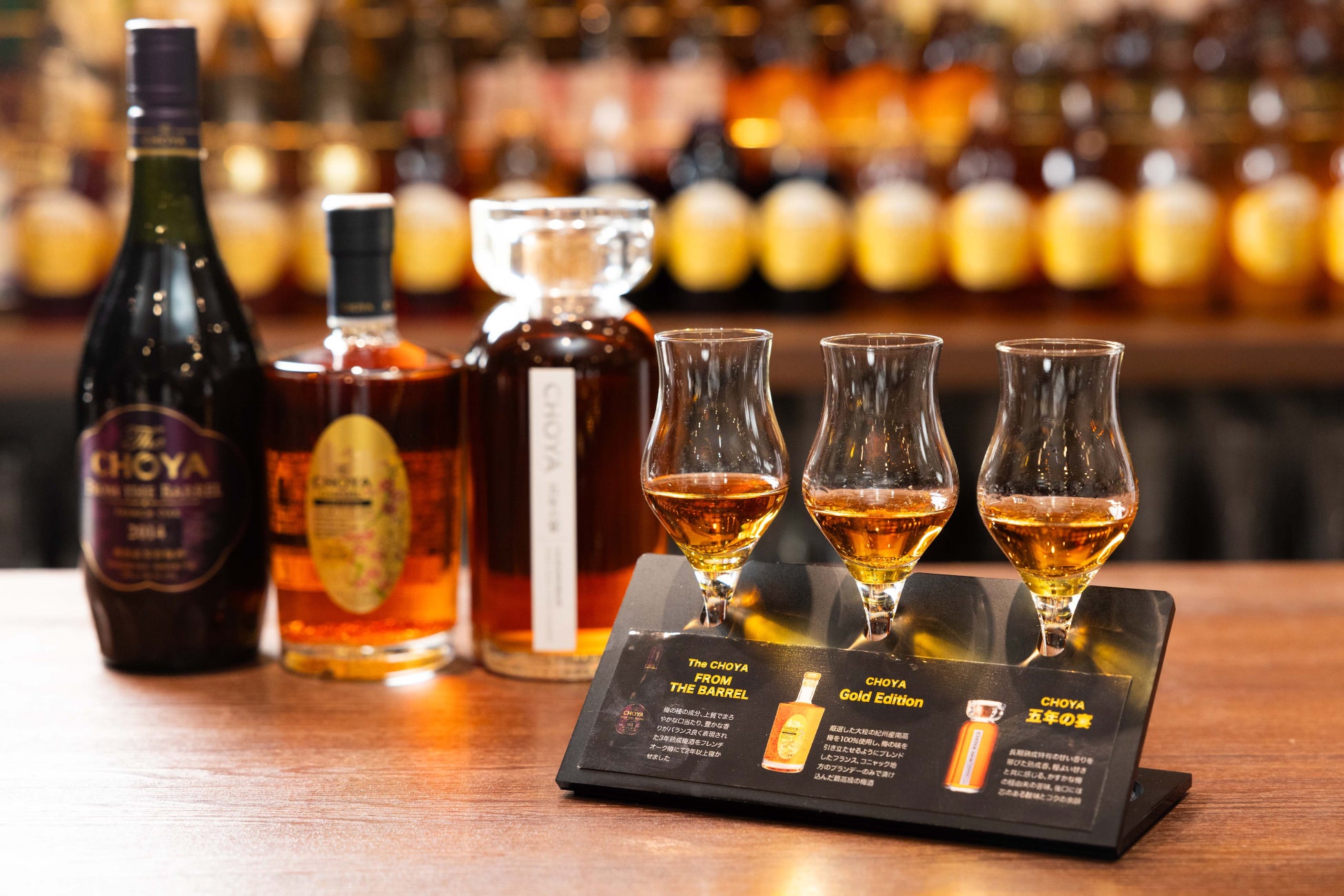3年以上熟成の梅酒をフレンチオーク樽で2年以上熟成させた「The CHOYA FROM THE BARREL」、金箔入りブランデー梅酒の「The CHOYA Gold Edition」、5年熟成南高原酒の「五年の宴」の3種類の飲み比べが楽しめる貴重な利き梅酒メニュー。