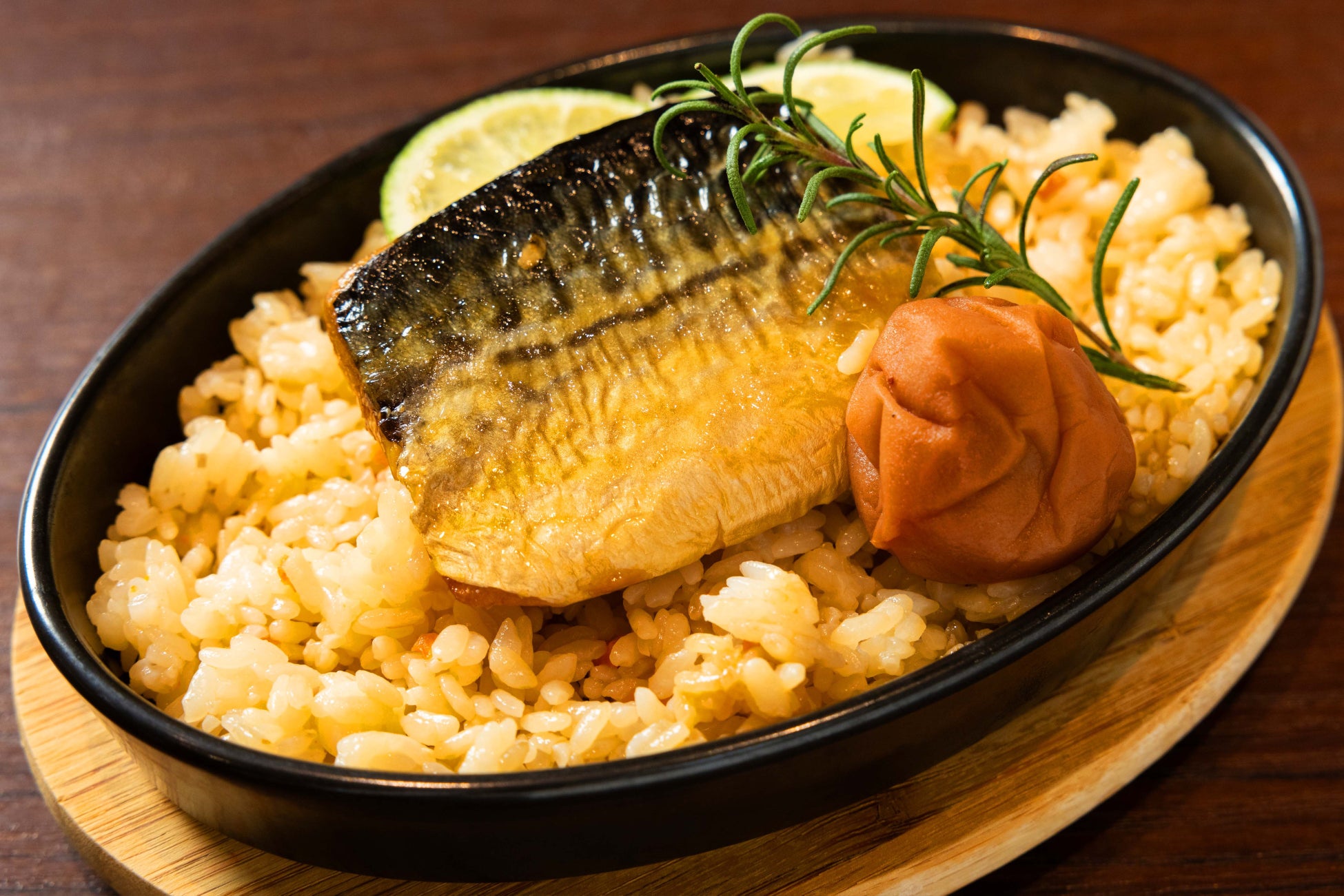 ・梅酒風味の鯖炊き込みご飯 燻製梅添え