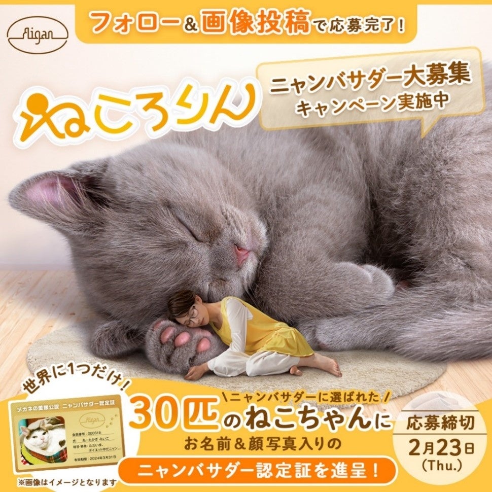 ご家族のねこちゃんが、ねころりんニャンバサダーに就任!?期間中、愛眼公式インスタグラムをフォローして画像を投稿していただいた中からねころりんニャンバサダーに選ばれた30匹のねこちゃんに【ねころりんニャンバサダー認定証】をプレゼント!その他、投稿していただいた画像は愛眼のホームページにて続々と紹介!愛らしいねこちゃんの画像投稿、クスっと笑える素敵な投稿お待ちしております!