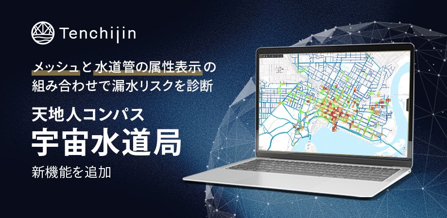 メッシュと水道管の属性表示の組み合わせで漏水リスクを診断し、効率的な水道維持管理を支援。「天地人コンパス 宇宙水道局」新機能を追加