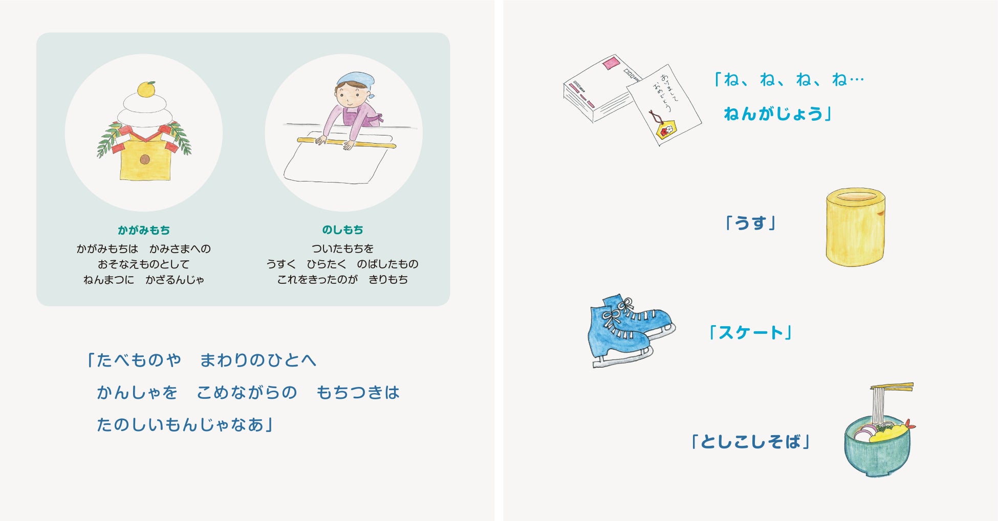 主⼈公はるき君が家族で過ごすお正月。お餅つきやおせち料理から、お正月飾りの由来や普段食べているものの原材料をおじいちゃんに教えてもらって、新しいことを知る楽しさに気づきます。繰り返し読むことで受験に⼤切な季節の名称が⾃然と頭に残ります。冬の習わしを楽しみながら学べる絵本。