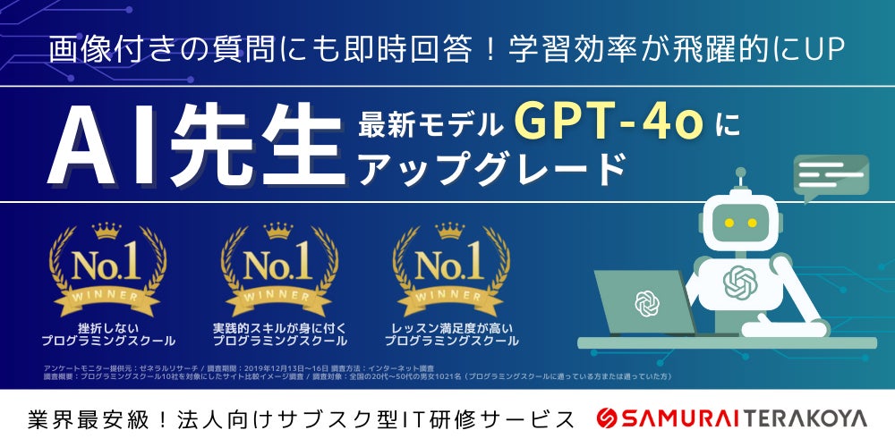 株式会社SAMURAIが運営する、プログラミング学習者の疑問を解決するQ&A掲示板『AI先生』は、使用するAI技術を「GPT-4 Turbo」から最新モデルである「GPT-4o」にアップグレードしたことをお知らせいたします。