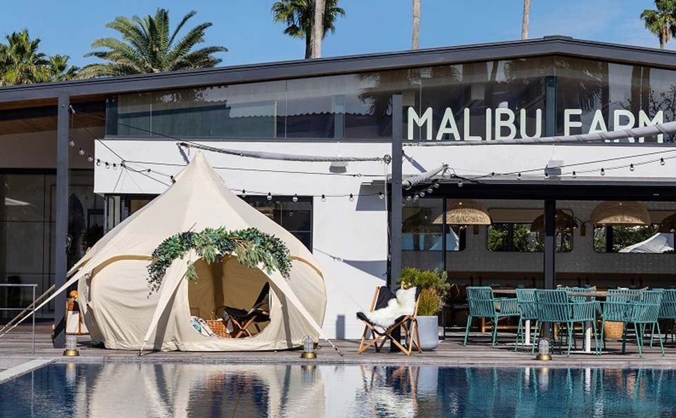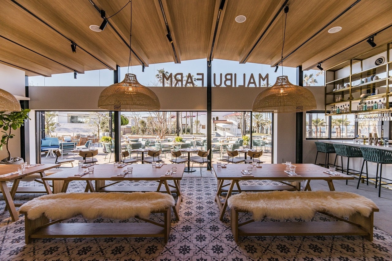 『マリブファーム 逗子マリーナ』では、現地の人気メニューの他、地元湘南の新鮮野菜や相模湾の魚介類を使用した日本限定メニューもご用意しています。全開可能なサッシによりテラス席と内部が一体となる設えで、約50席の屋内席の他、マリーナの海から繋がるような大きな水盤が広がる約80席のテラスには、三方を水に包まれたウォーターテラス席や、暖炉を囲むファイヤーテラス席などシチュエーションに応じてお使いいただけます。豊富なテラス席を有するため、ペット同伴でのお食事に最適なレストランです。