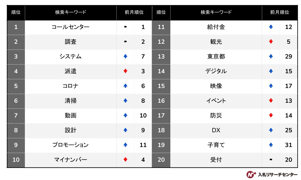 入札案件 検索キーワードは、6ヶ月連続で「コールセンター」が第1位 業種カテゴリ別 公示案件数は「旅行・宿泊・インバウンド関連業務」が2ヶ月連続で上昇傾向