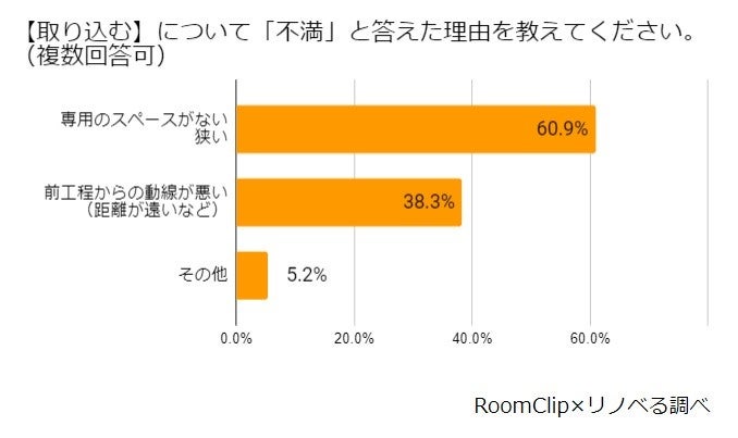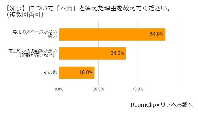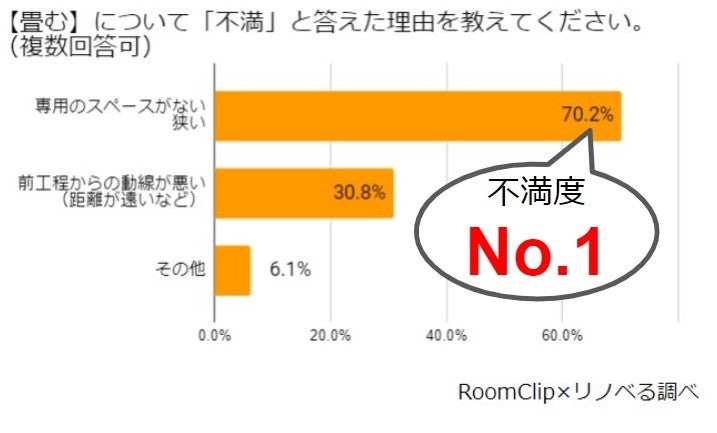続いて、各工程について「不満」と回答した方に、どんな不満があるか質問したところ、いずれの工程も1位は「専用のスペースがない(狭い)」ことが挙げられました。最も不満度が高かったのは「畳む」工程の「専用のスペースがない/狭い」でした。「しまう」工程を想定して洗濯物のカテゴリに分けたり、大きなものを畳むなど、「畳む」作業はある程度のスペースが必要であるにもかかわらず、その場所が確保できていない様子が垣間見られました。また、「畳む」後工程となる「しまう」では、「畳む」からの動線への不満が53.1%と、スペースへの不満とほぼ同等の結果となりました。まとめて畳んだ後に、家の様々な場所に点在する収納スペースに「しまう」作業に対するストレスを感じられている方が多いようです。
