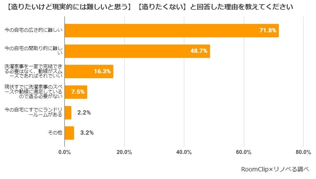 ■「造りたいけど現実的には難しいと思う」「造りたくない」と回答した理由は、「今の自宅の広さ的に難しい」(71.8%)、次いで「今の自宅の間取り的に難しい」(48.7%)が多く、物理的な難しさを感じている。一方で、「洗濯家事を一室で完結できる必要はなく、動線がスムーズであればそれでいい」(16.3%)という回答も一定数あり、「スペースの狭さ」を「動線の最適化」でカバーできるリノベーションの可能性を感じる結果となった。