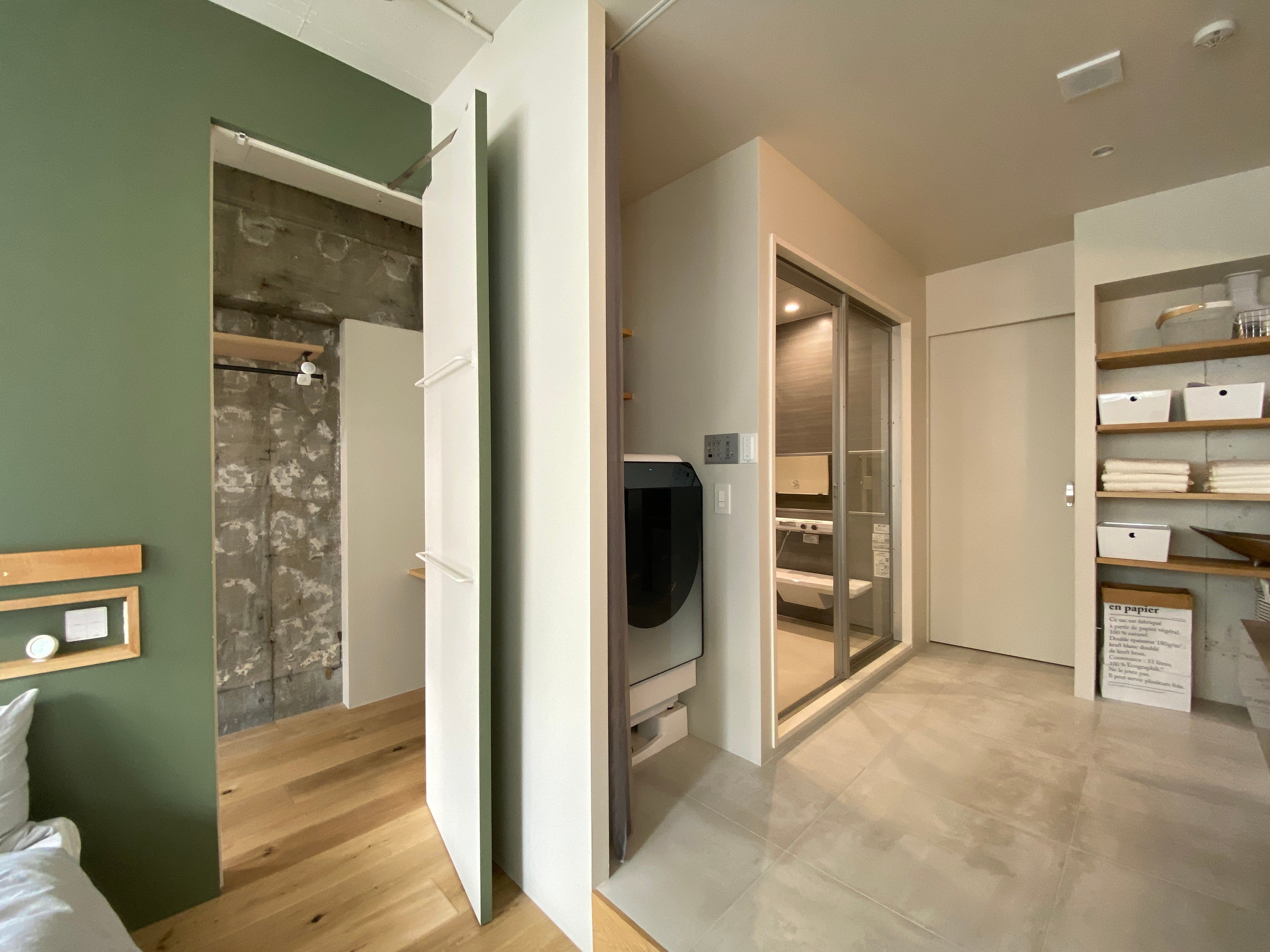 回遊動線を活用してとことん家事動線にこだわり大きな時短が実現できる、9月23日(土)オープン予定の「リノベる。名古屋 高岳ショールーム」。今回の調査で最も不満度が高かった「畳む」工程の専用スペースも、洗濯機の脇に折り畳み式の洗濯畳み台を設置することでクリアしています。そして廊下を横切ると大容量のウォークスルークローゼットがあり、不満の多い「畳む」→「しまう」動線もスムーズです。キッチンと洗面脱衣所の仕切りは引き戸でつながっているため、洗濯畳み台は通常折り畳んでおくことで、洗濯機からベランダも最短距離を実現。「洗う」から「しまう」まで、すべてのの作業が流れるように実現する間取りになっています。
