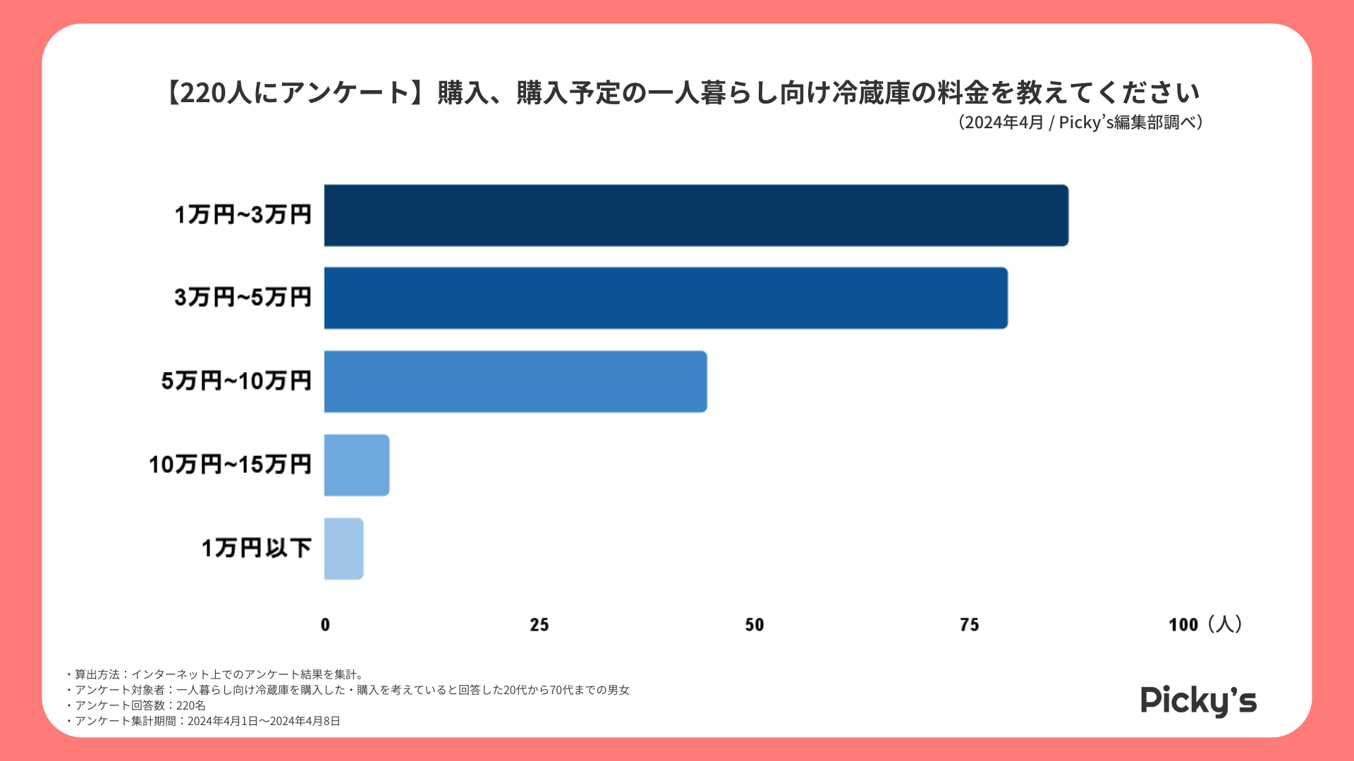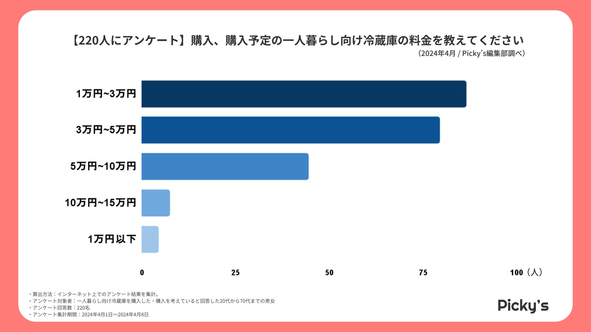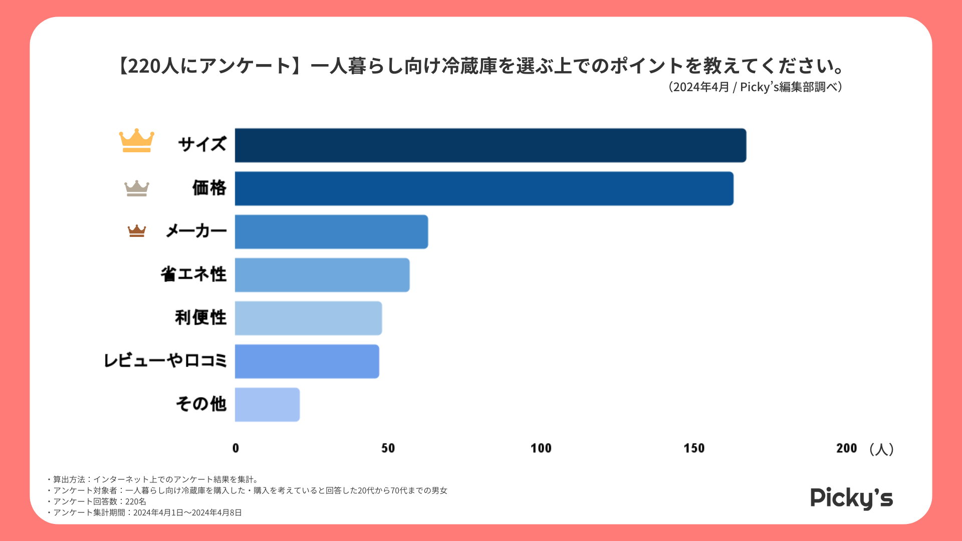 「Picky’s」は、インターネットショッピングにおいて、購入前に試せない・選ぶべきものがわからないという課題の解決を目標に、あらゆる商品のおすすめランキングや検証レビューを紹介するサイトです。このたびPicky’s(https://rentry.jp/)では、春の新生活に先駆けて、一人暮らし向け冷蔵庫についてインターネット上でアンケート調査を行いましたので発表いたします。