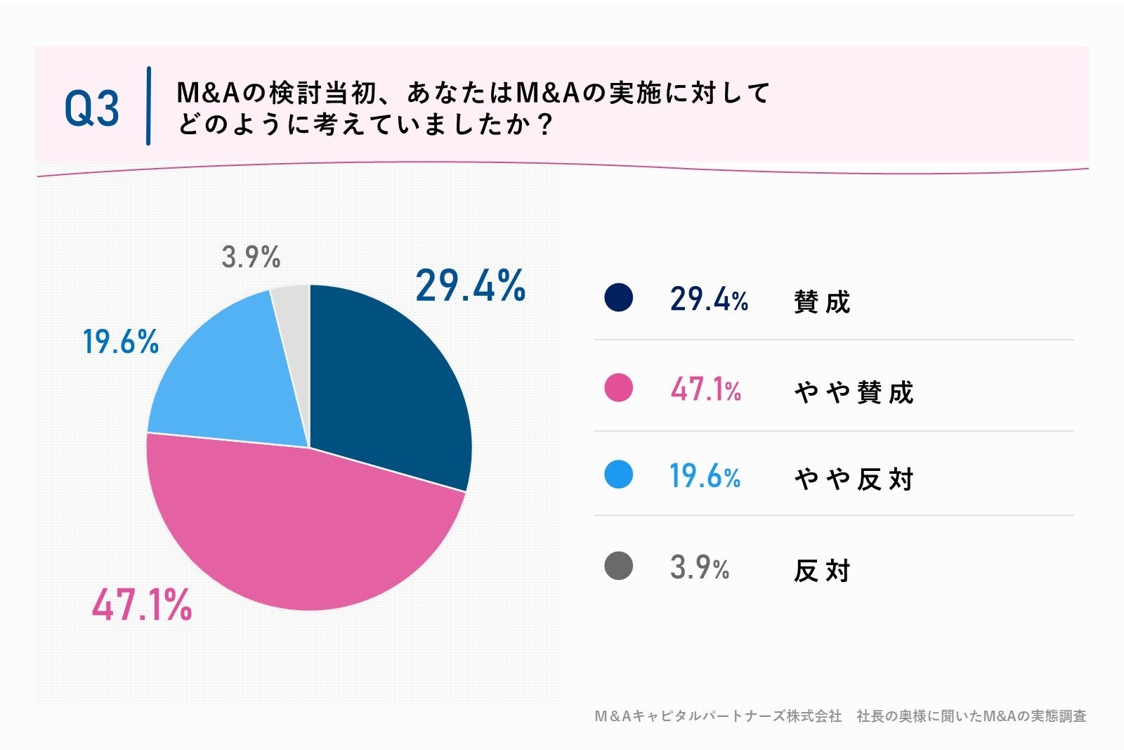 「Q3.M&Aの検討当初、あなたはM&Aの実施に対して、どのように考えていましたか。」(n=51)と質問したところ、「賛成」が29.4%、「やや賛成」が47.1%という回答となりました。