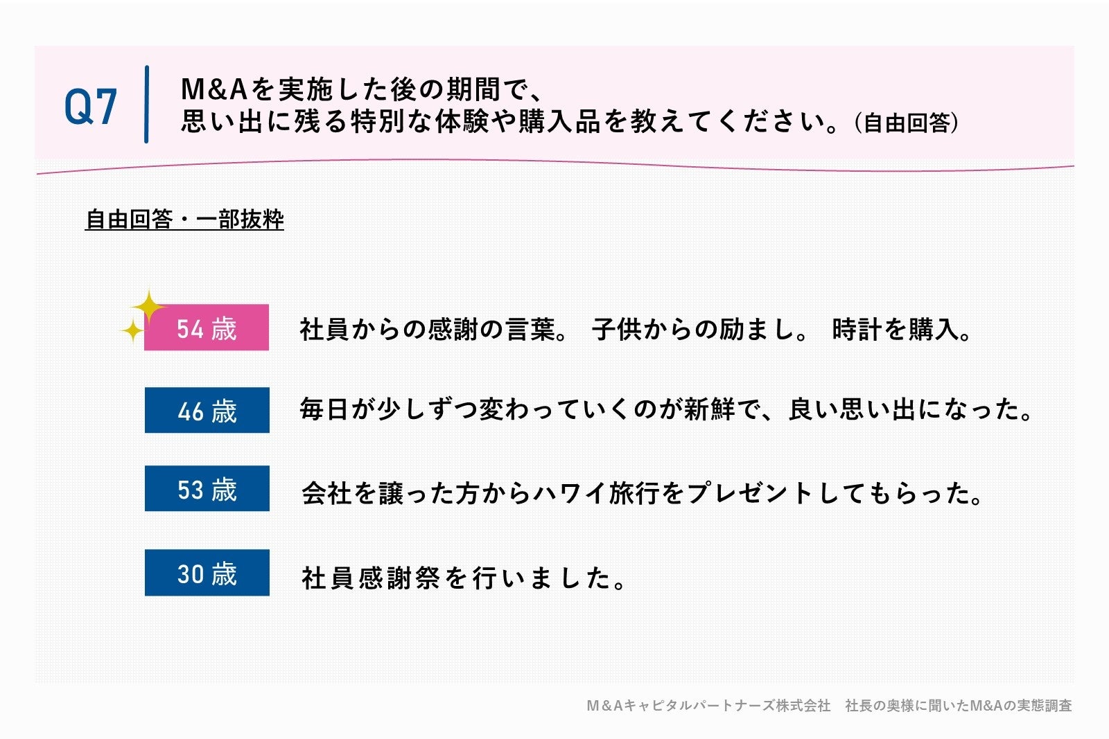 「Q7.M&Aを実施した後の期間で、思い出に残る特別な体験や購入品を教えてください(自由回答)」(n=51)と質問したところ、「会社を譲った方からハワイ旅行をプレゼントしてもらった」や「社員からの感謝の言葉」など51の回答を得ることができました。