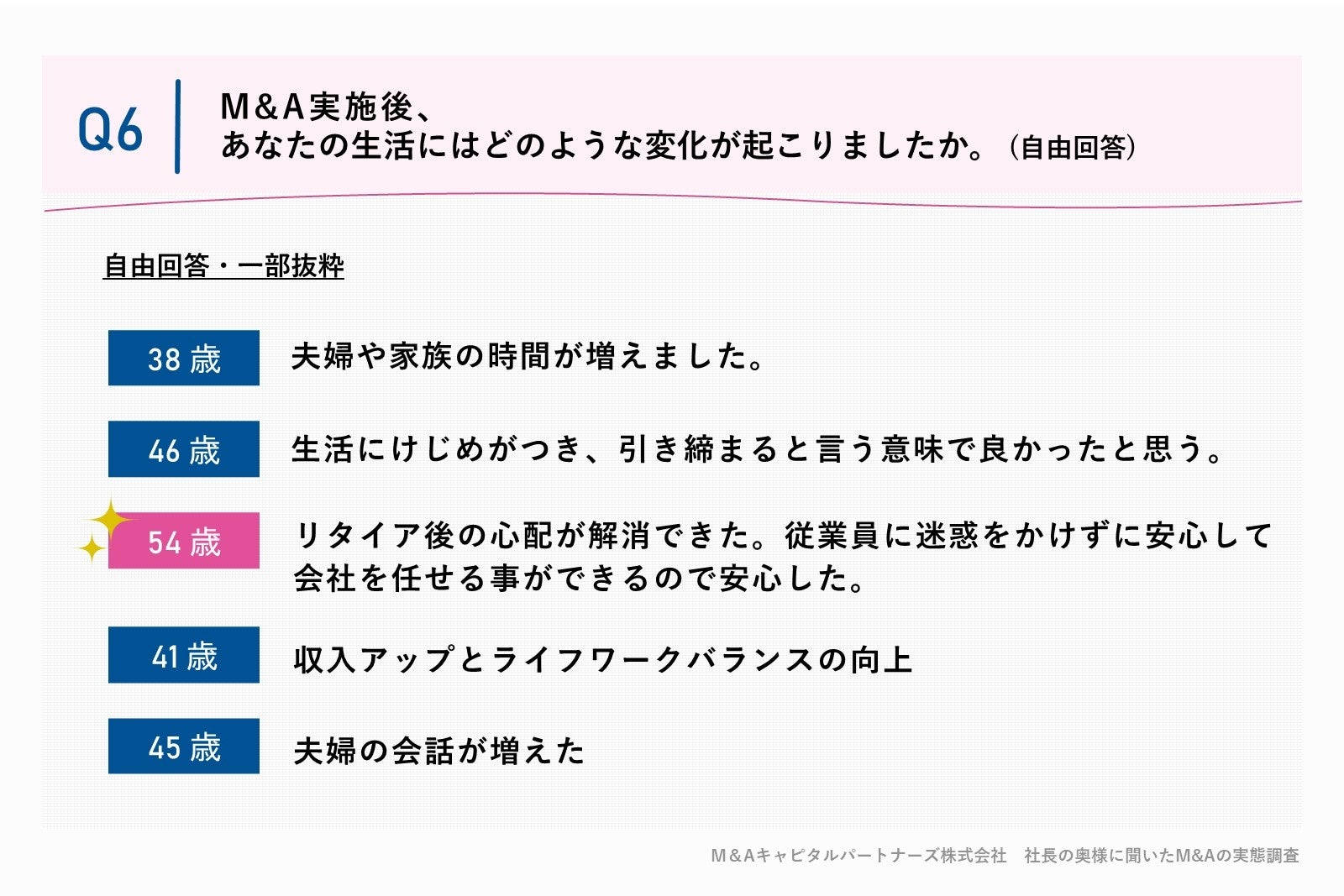 「Q6.M&A実施後、あなたの生活にはどのような変化が起こりましたか。(自由回答)」(n=51)と質問したところ、「夫婦や家族の時間が増えました」や「借り入れや融資などの悩みがなくなった」など51の回答を得ることができました。
