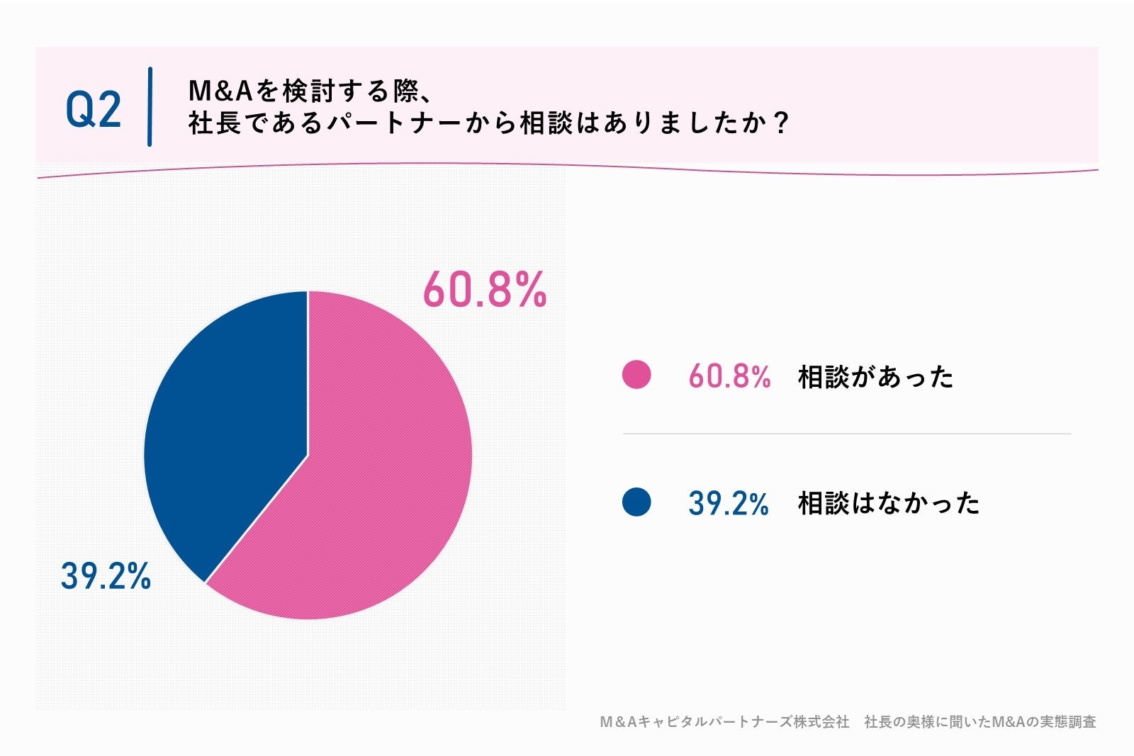 「M&Aを検討する際、社長であるパートナーから相談はありましたか。 」(n=51)と質問したところ、「あった」が60.8%、「なかった」が39.2%、という回答となりました。