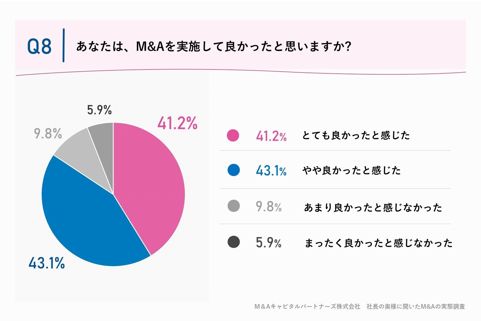 「Q8.あなたは、M&Aを実施して良かったと思いますか。」(n=51)と質問したところ、「とても良かったと感じた」が41.2%、「やや良かったと感じた」が43.1%という回答となりました。