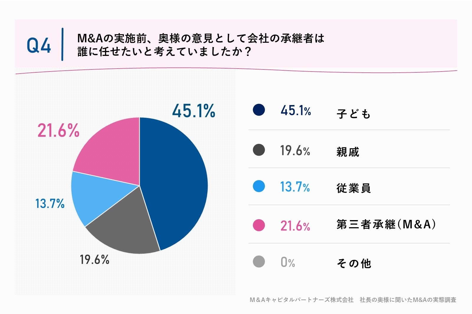 「Q4.M&Aの実施前、奥様の意見として会社の承継者として誰に任せたいと考えていましたか。 」(n=51)と質問したところ、「子ども」が45.1%、「第三者承継(M&A)」が21.6%という回答となりました。