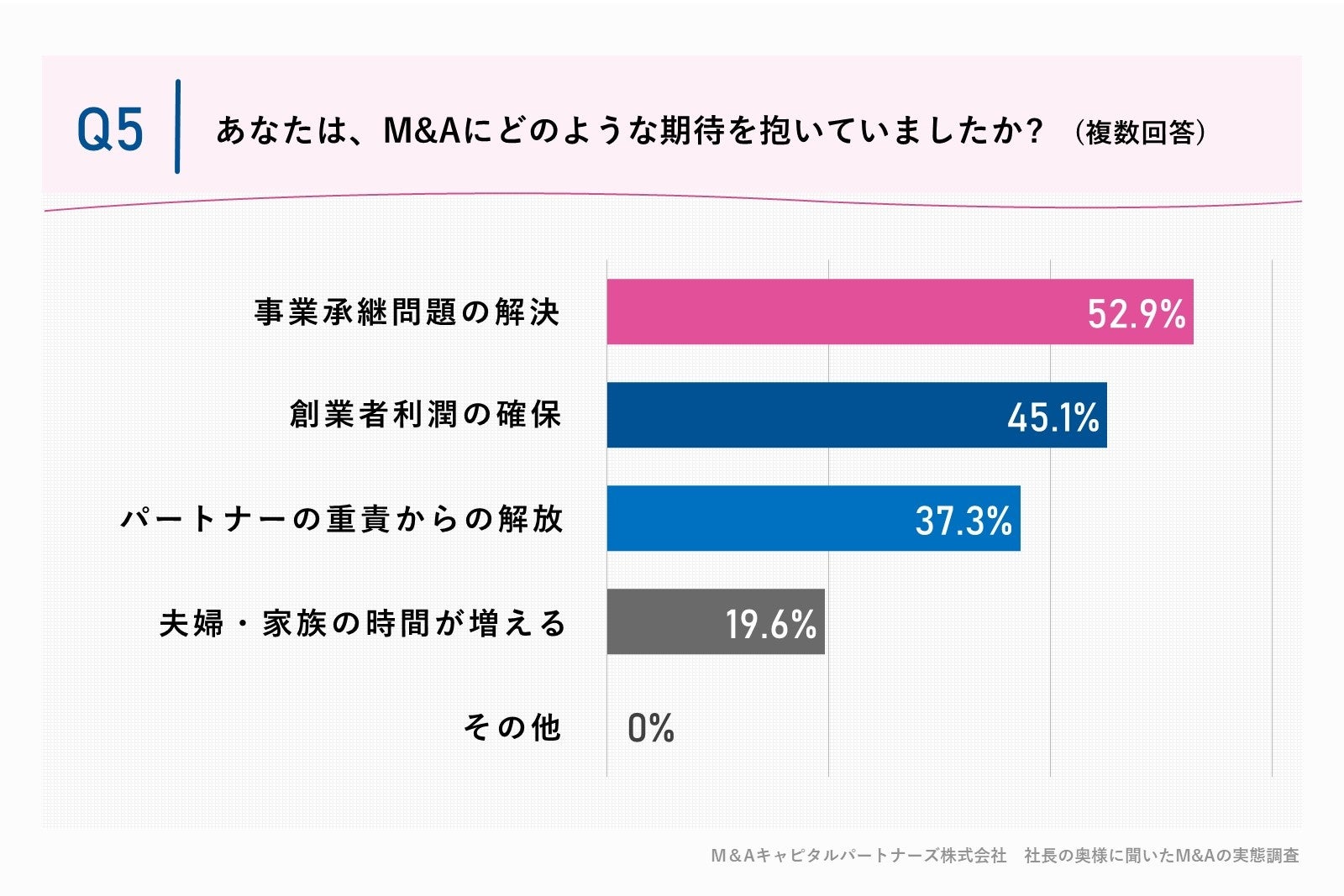 「Q5.あなたは、M&Aにどのような期待を抱いていましたか。(複数回答)」(n=51)と質問したところ、「事業承継問題の解決」が52.9%、「創業者利潤の確保」が45.1%、という回答となりました。