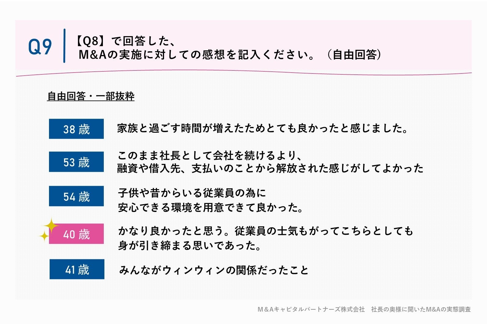 「Q9.M&Aの実施に対しての感想を記入ください。(自由回答)」(n=51)と質問したところ、「子供や昔からいる従業員の為に安心できる環境を用意できて良かった。」など51の回答を得ることができました。