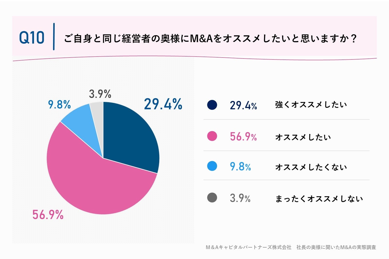 「Q10.ご自身と同じ経営者の奥様にM&Aをお勧めしたいと思いますか。 」(n=51)と質問したところ、「強くお勧めしたい」が29.4%、「お勧めしたい」が56.9%という回答となりました。