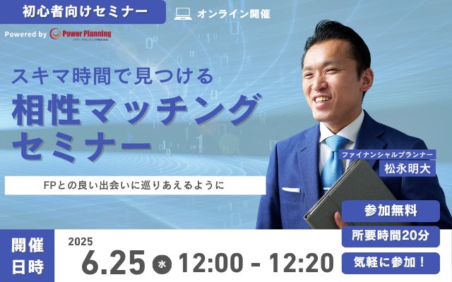 6月25日(水) 12時より、スキマ時間を活用して自分に合ったFPを探すことができる、松永明大講師との「相性マッチングセミナー(無料)」を開催いたします