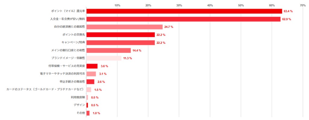 「ポイント(マイル)還元率」、および「入会金・年会費の安さ」を重視している人が圧倒的に多数という結果になった。なお、その他には「自分の経済圏との親和性」や「ポイントの交換先」を選ぶ人も多かった。