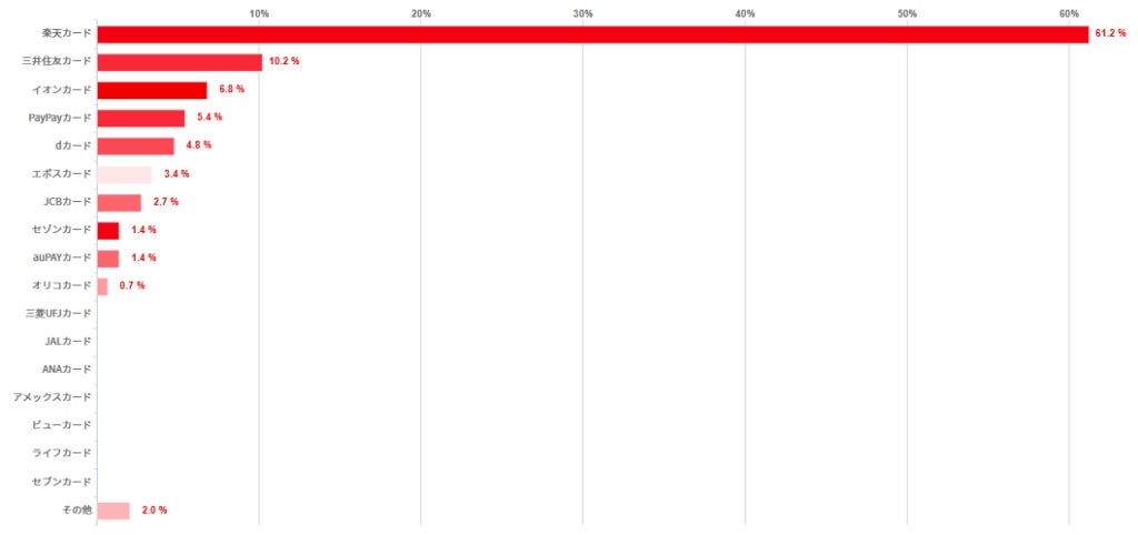 楽天カードが61.2%で圧倒的に多く、三井住友カード(10.2%)やイオンカード(6.8%)などがこれに続いた。