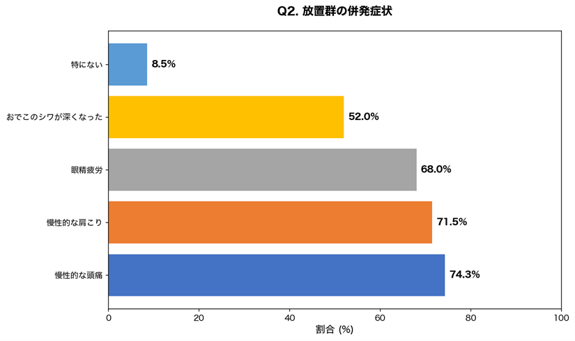 【調査結果】1年以上放置群の74.3%が「慢性的な頭痛・肩こり・眼精疲労」を併発