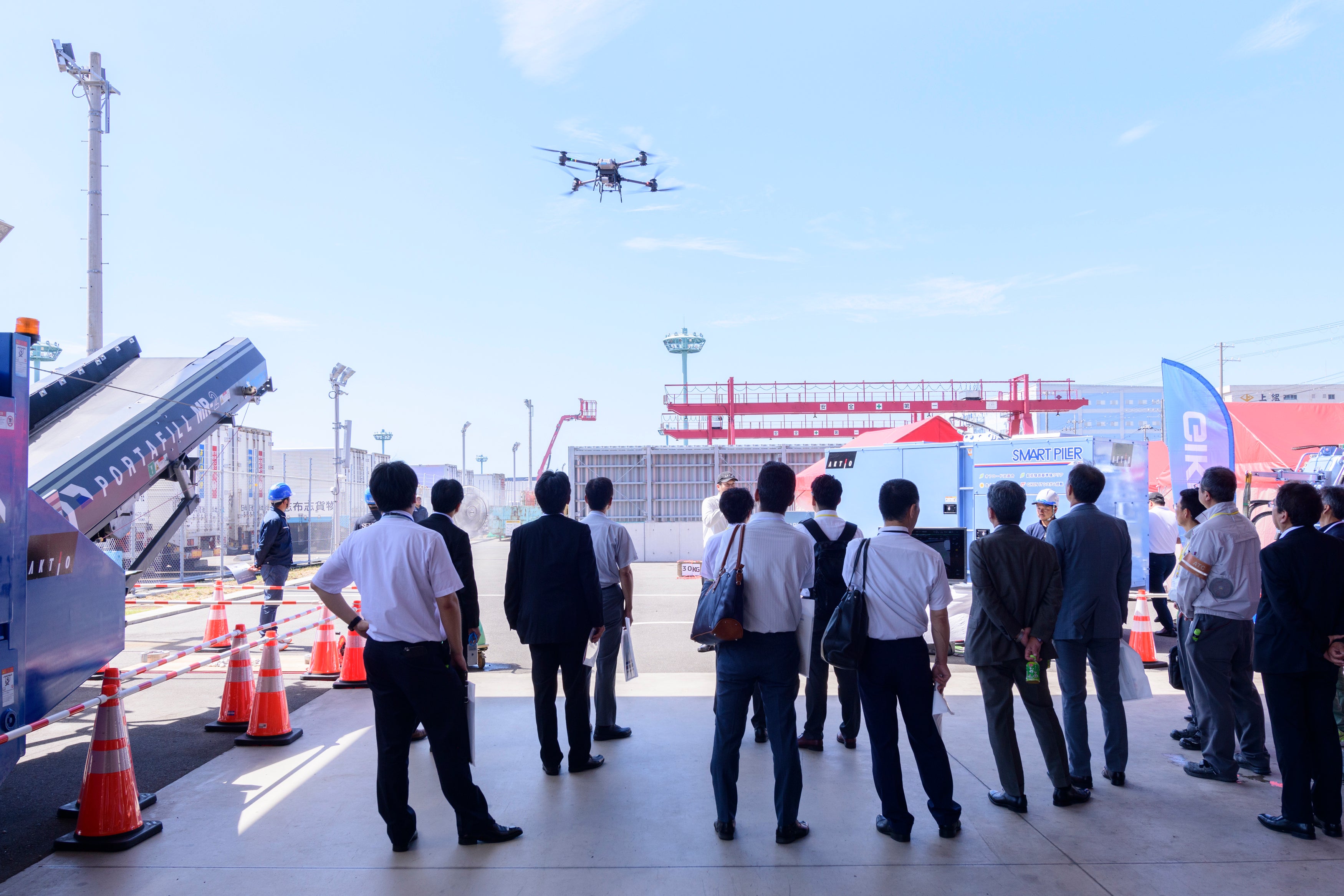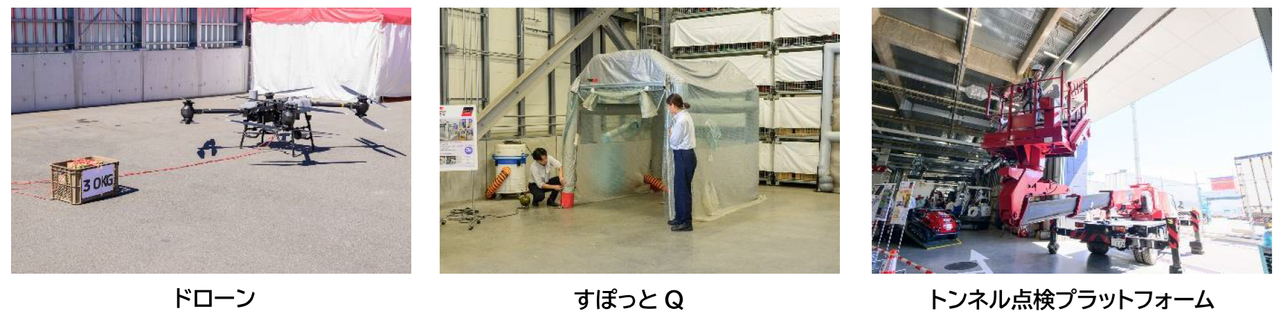最大30kgまで運搬可能なドローンを展示しました。以前行った実証実験では、咲州から海を渡り、夢洲の万博工事現場まで資機材を運びました。エアー式養生テント「すぽっとQ」は、竹中工務店、朝日機材、アキレス、アクティオの4社で開発した、粉塵飛散防止ができる商品です。付属のコンプレッサーで空気を送り込むと自立するエアフレーム型のため、3分もあれば設置が可能です。「トンネル点検プラットフォーム」は、トンネルの点検・補修に特化した車両です。最大の特徴としてデッキ部分が階段状に変形し、トンネルのR部分にアプローチしやすくなります。これらの商品は、省人化、環境保護、生産性向上に貢献し、建設業界に新たな可能性をもたらします。